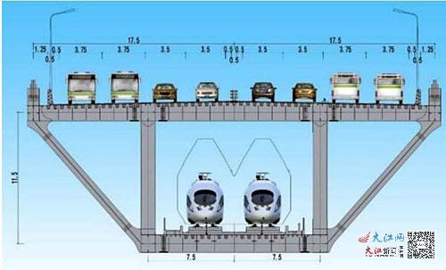 從環評報告中的規劃圖可以看出,這座公鐵兩用橋梁上方為雙向八車道(四車道)的公路橋,下方為高鐵線橋梁。
