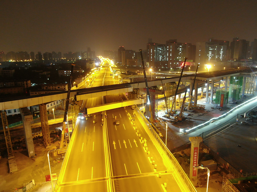此次吊裝任務要在原有南北方向的高架橋上方,跨過已有的2層高架橋和匝道,再搭建一座東西方向的橋,最終形成十字錯層道路。建成之后,算上路面,該路段共有4層可以實現通車。